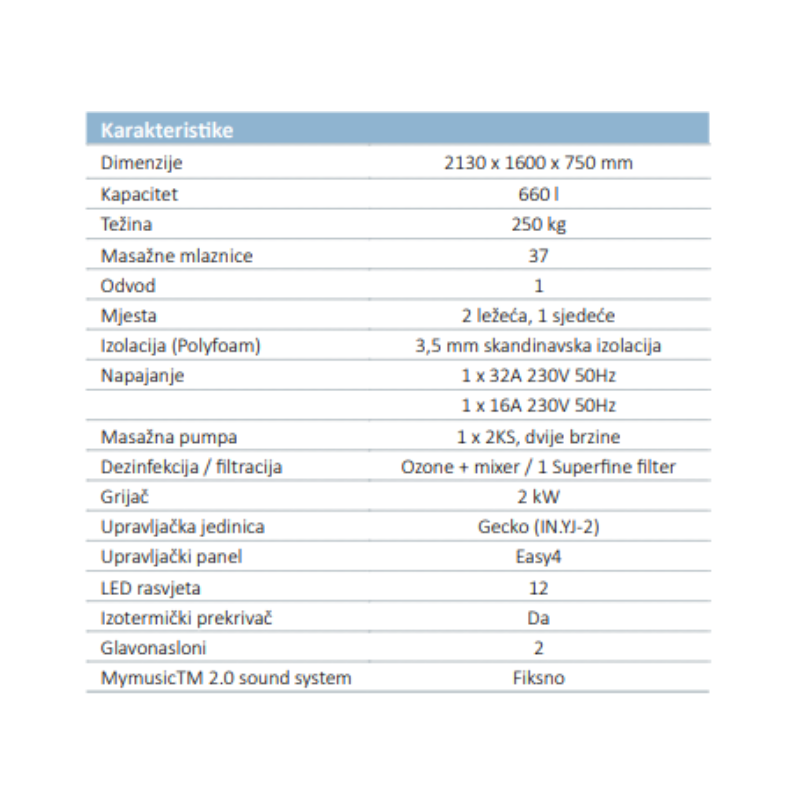 Dizajnirajući MySeat naslon, dizajneri su eliminirali neprijatnosti koje mogu biti izazvane razlikom u visini korisnika. Korisnici na nižoj i višoj poziciji istovremeno mogu podjednako uživati u nevjerojatnoj masaži koju pruža ovaj model kade. Hidromasažni bazen je visine samo 76 cm, što mu omogućuje da prođe kroz standardne dimenzije vrata, a to ga čini veoma lakim za ugradnju. Iako je malih dimenzija, ovaj model je dovoljno prostran da sadrži 37 mlaznica, čime zadržava svoju najveću prednost – vrlo lako može da se montira na većini mjesta, bilo da je to terasa ili malo veće kupatilo.